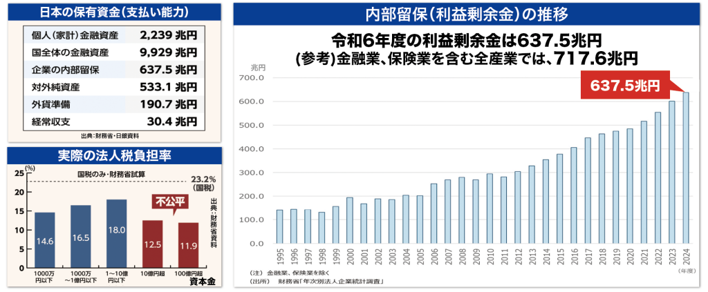 企業の内部留保(利益剰余金)は年々増加し、700兆円を超えていて、日本の年間のGDPをも超えています。